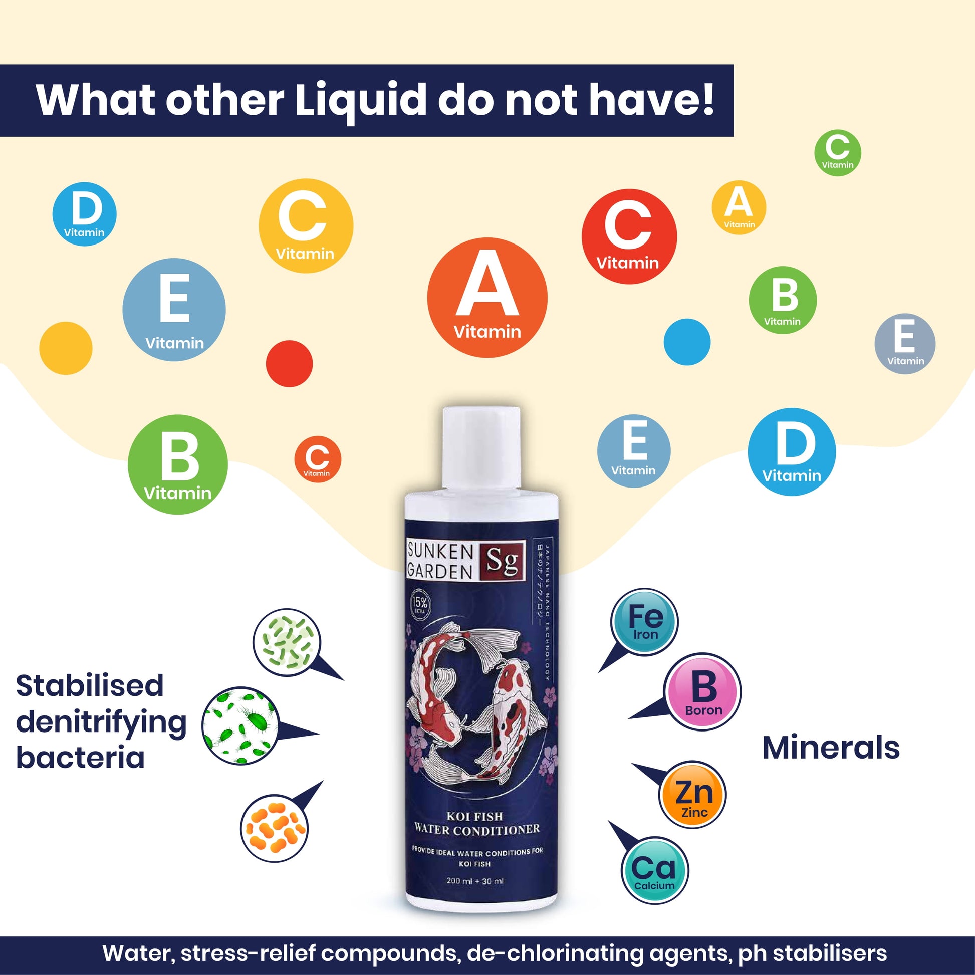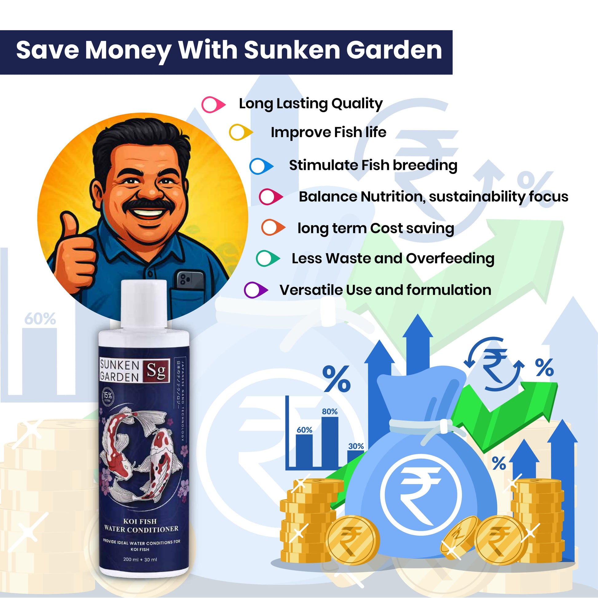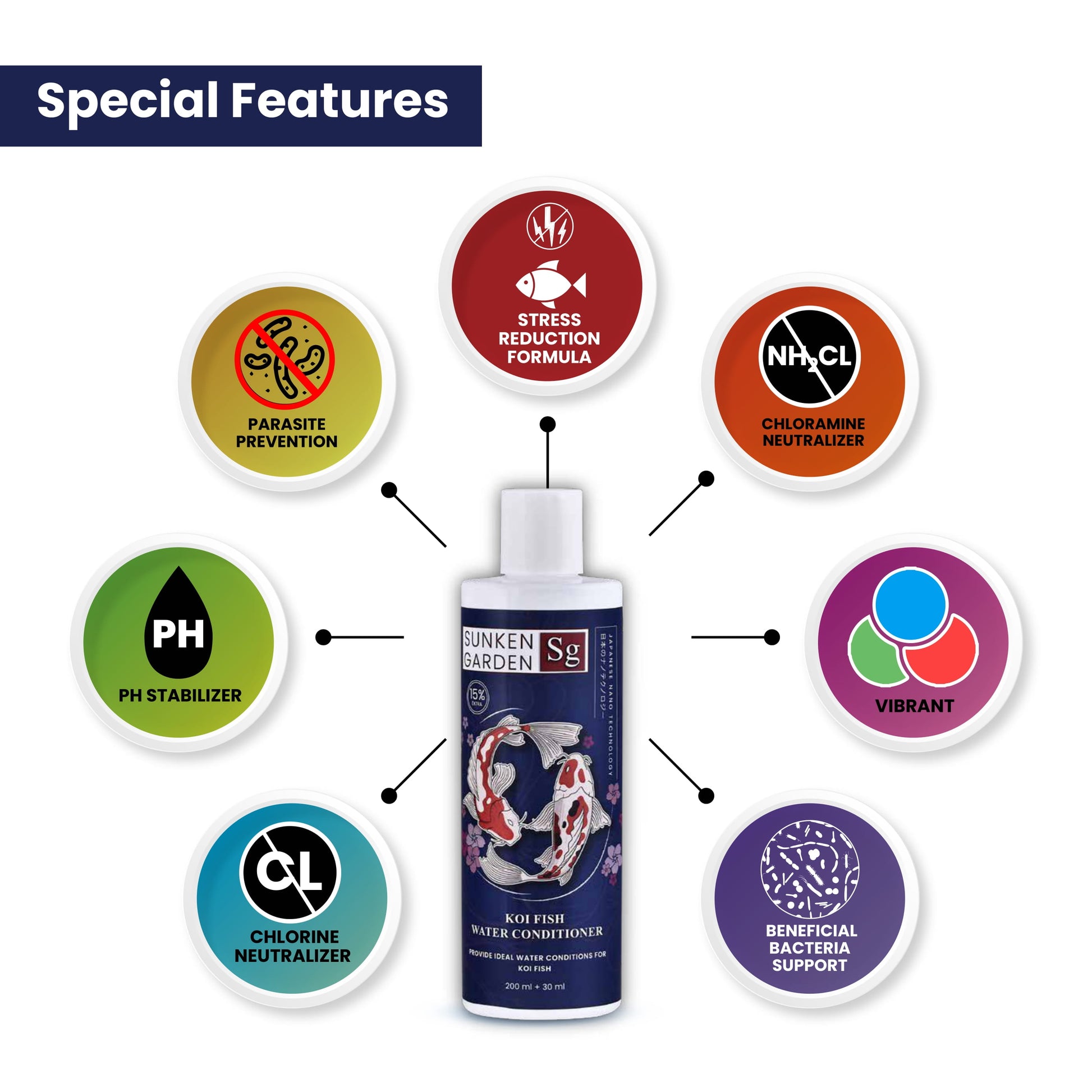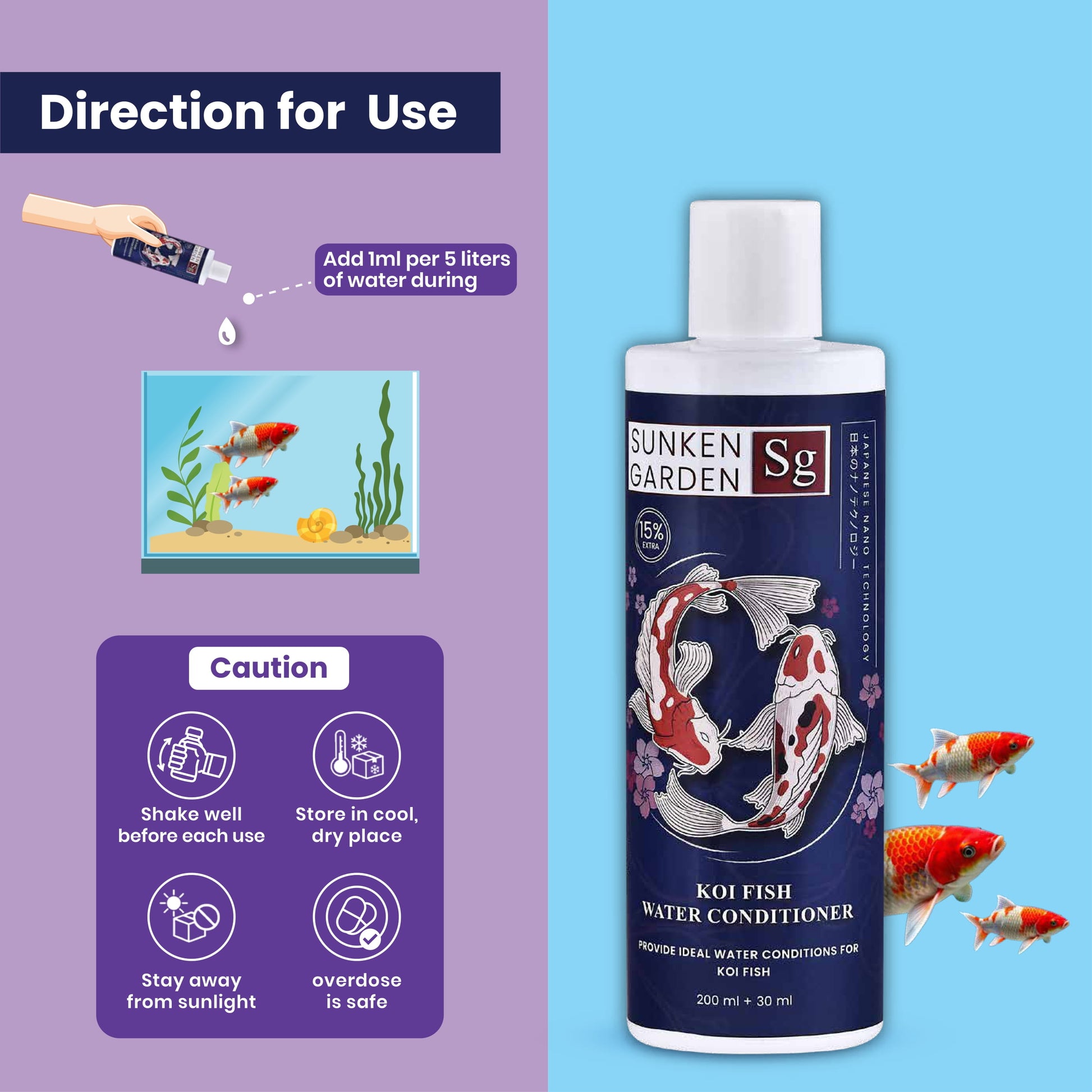 सनकेन गार्डन कोइ फिश वॉटर कंडीशनर तालाबों और बड़े एक्वेरियम के लिए एक विशेष रूप से तैयार किया गया बहु-लाभ वाला जल देखभाल समाधान है जिसमें कोइ और अन्य सजावटी मछलियाँ रहती हैं। यह प्राकृतिक जापानी तालाब की स्थितियों को दोहराने में मदद करता है , जिससे यह सुनिश्चित होता है कि आपका कोइ सक्रिय, जीवंत और रोग-मुक्त रहे ।