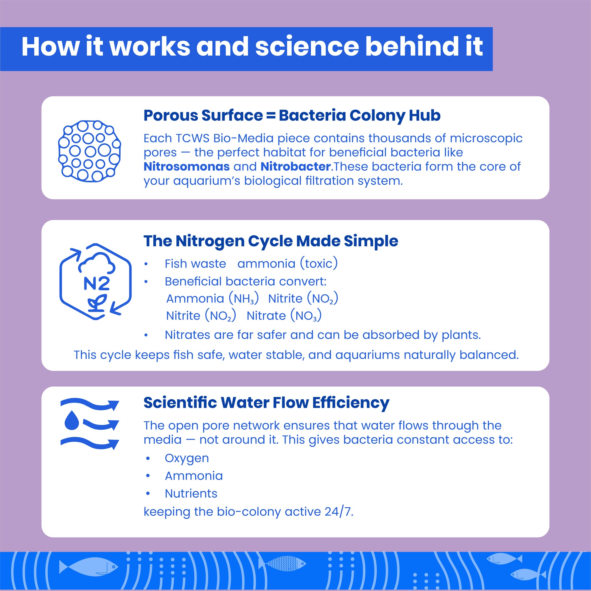 TCWS बायो-मीडिया - ताजा पानी और प्लांटेड एक्वेरियम झरझरा निस्पंदन मीडिया का मिश्रण है जिसे विशेष रूप से प्रकृति के जल शोधन प्रणाली को फिर से बनाने के लिए डिज़ाइन किया गया है। झरझरा प्राकृतिक पत्थर में उच्च पारगम्यता होती है और यह निस्पंदन बैक्टीरिया को उपनिवेश बनाने के लिए एक आदर्श वातावरण प्रदान करता है। यह कार्बनिक पदार्थों को हटाने में भी मदद करता है, जो जल प्रदूषण का कारण बनते हैं और सूक्ष्मजीवों के काम के माध्यम से जल्दी से खराब हो जाते हैं।