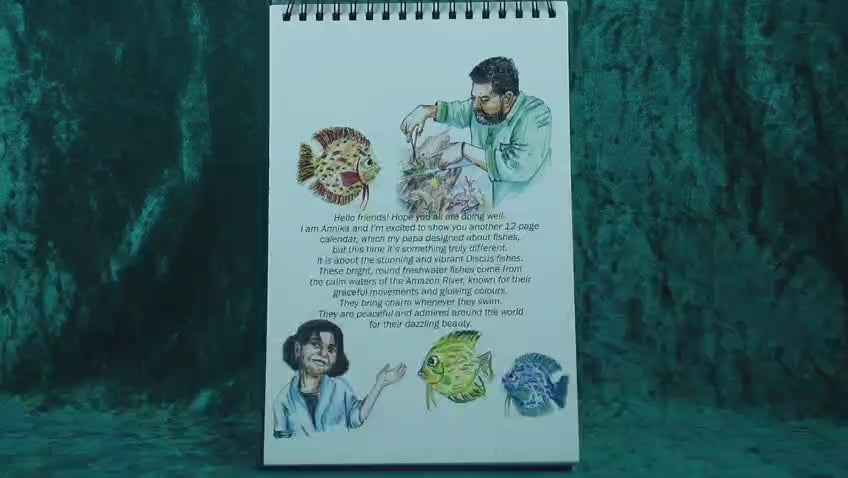 Narrated through the heartfelt voice of Annika, the daughter of artist Mayur Dev, this calendar beautifully connects you to the magical world of Discus fishes. Every page reflects the dedication of a father–artist who has spent years observing and understanding aquatic life, transforming it into art that feels alive.