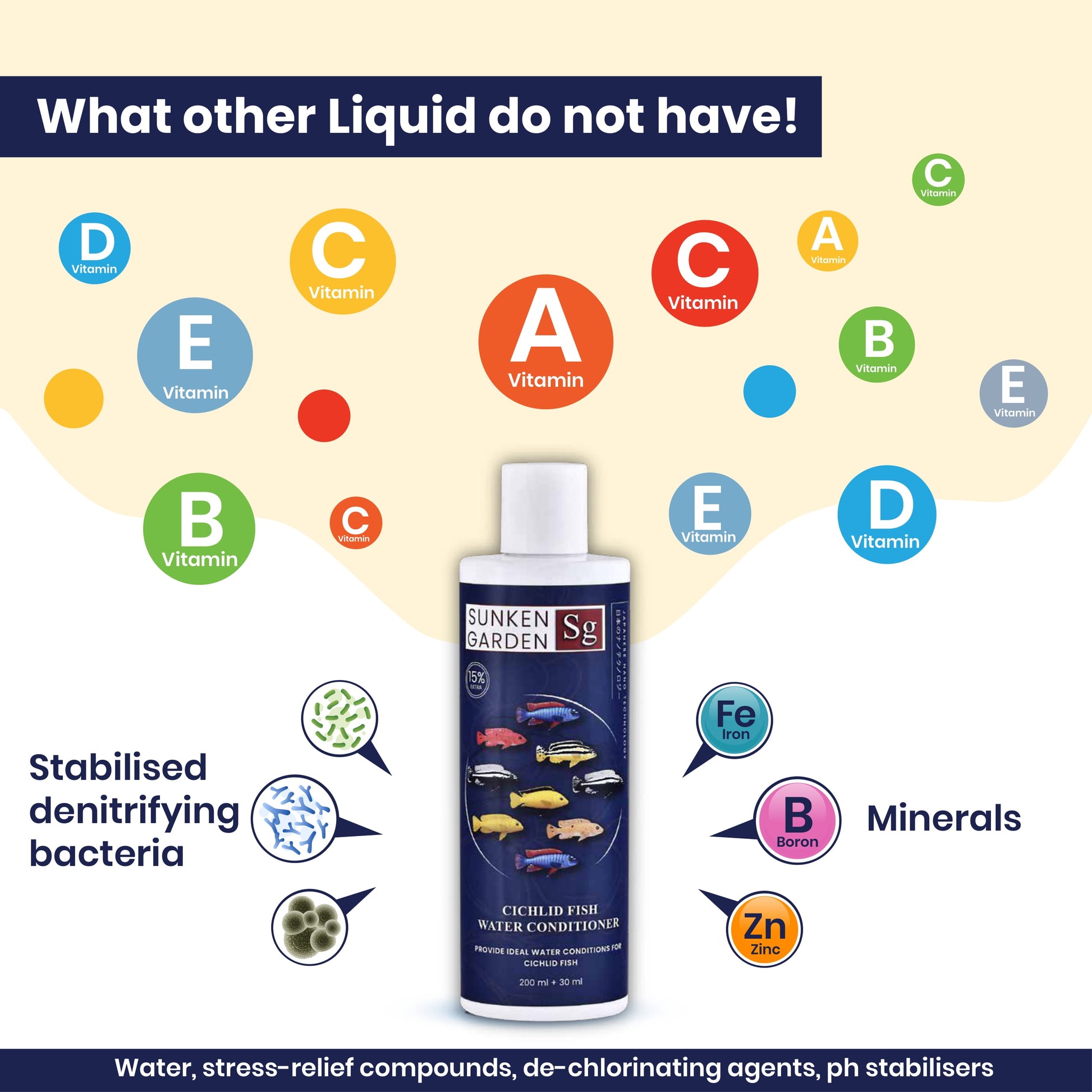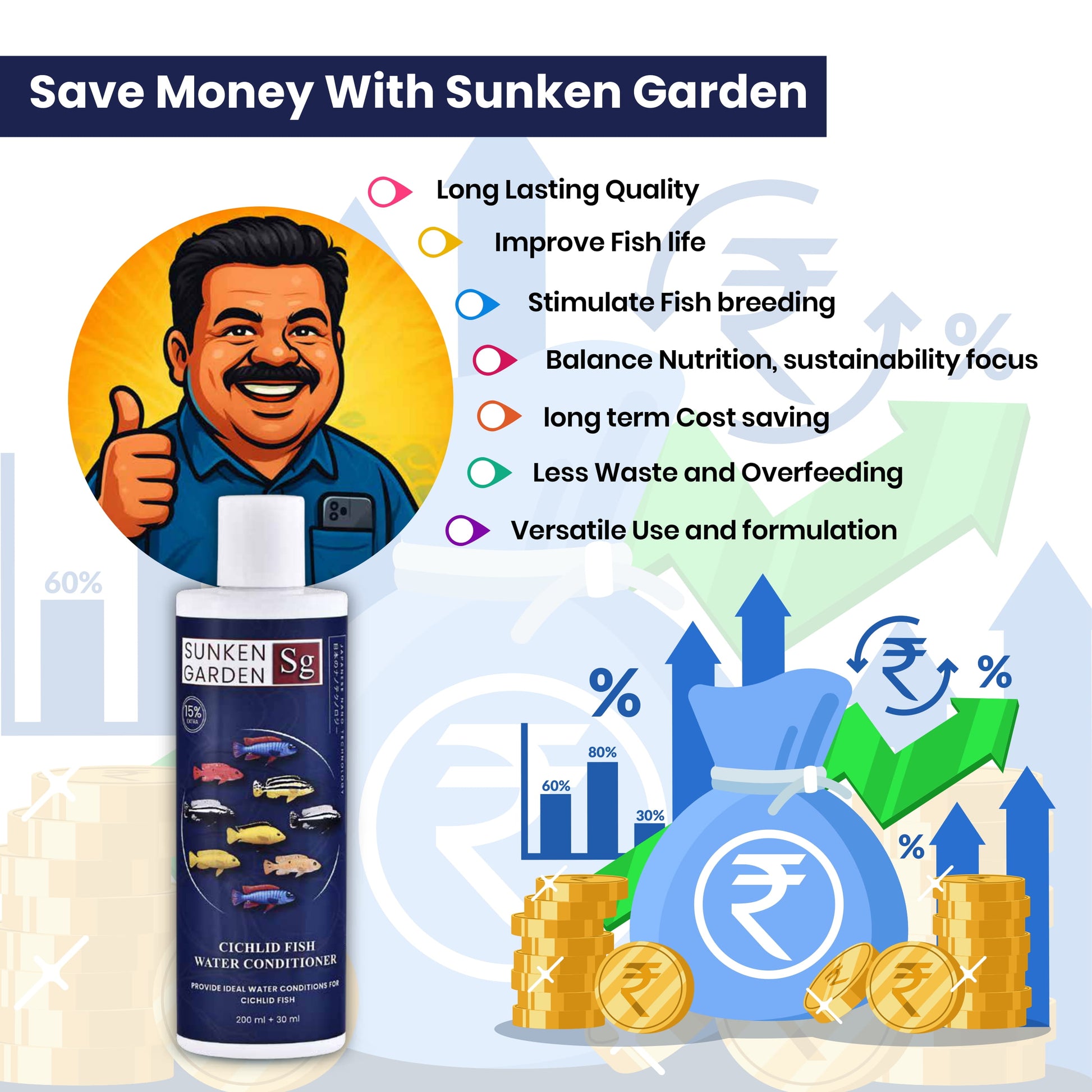 Sunken Garden Cichlid Fish Water Conditioner is a multi-action formula crafted to meet the specific needs of all cichlid species. It replicates their ideal pH range, supports natural aggression control, strengthens immunity, and reduces disease risk, all while enhancing color and behavior.