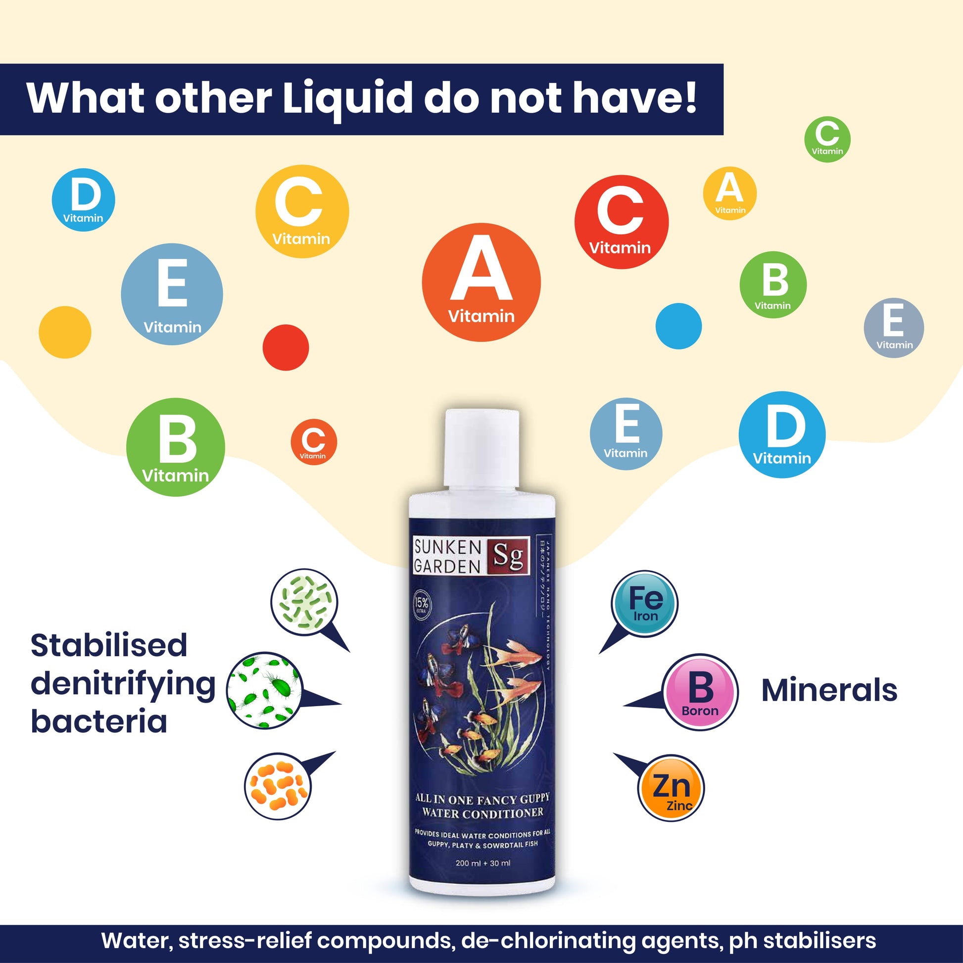 Enhance your guppy aquarium with Sunken Garden Guppy Fish Water Conditioner for a vibrant, healthy, and thriving aquatic ecosystem.